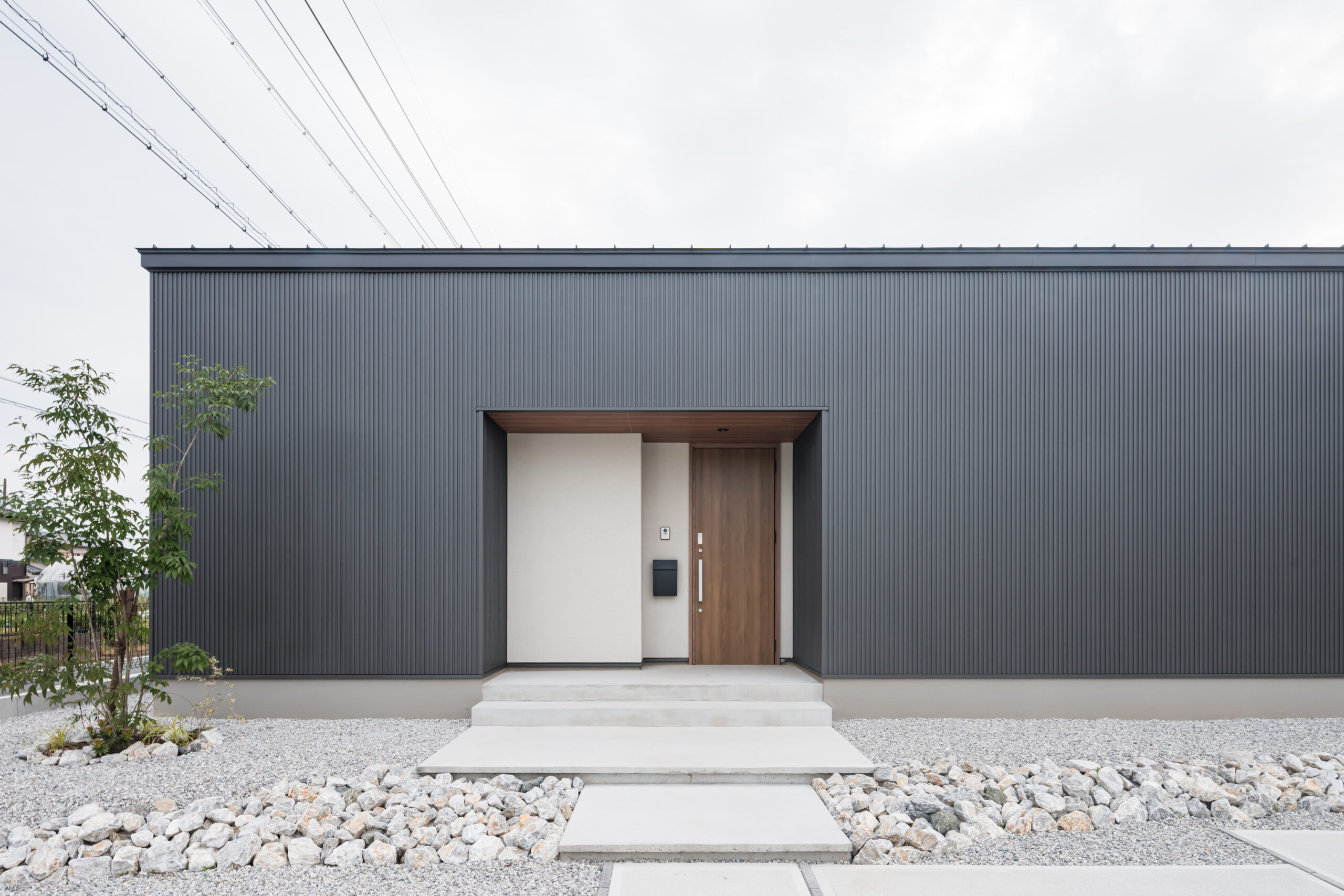 • 外観/ グレーのガルバリウム鋼板の外壁は力強さを表現し、 木目と塗り壁の玄関で建物全体を落ち着かせ、モダンなデザインに。 ずっと叶えたかった外観デザインを実現した家は、眺めるたびに心が弾みます。