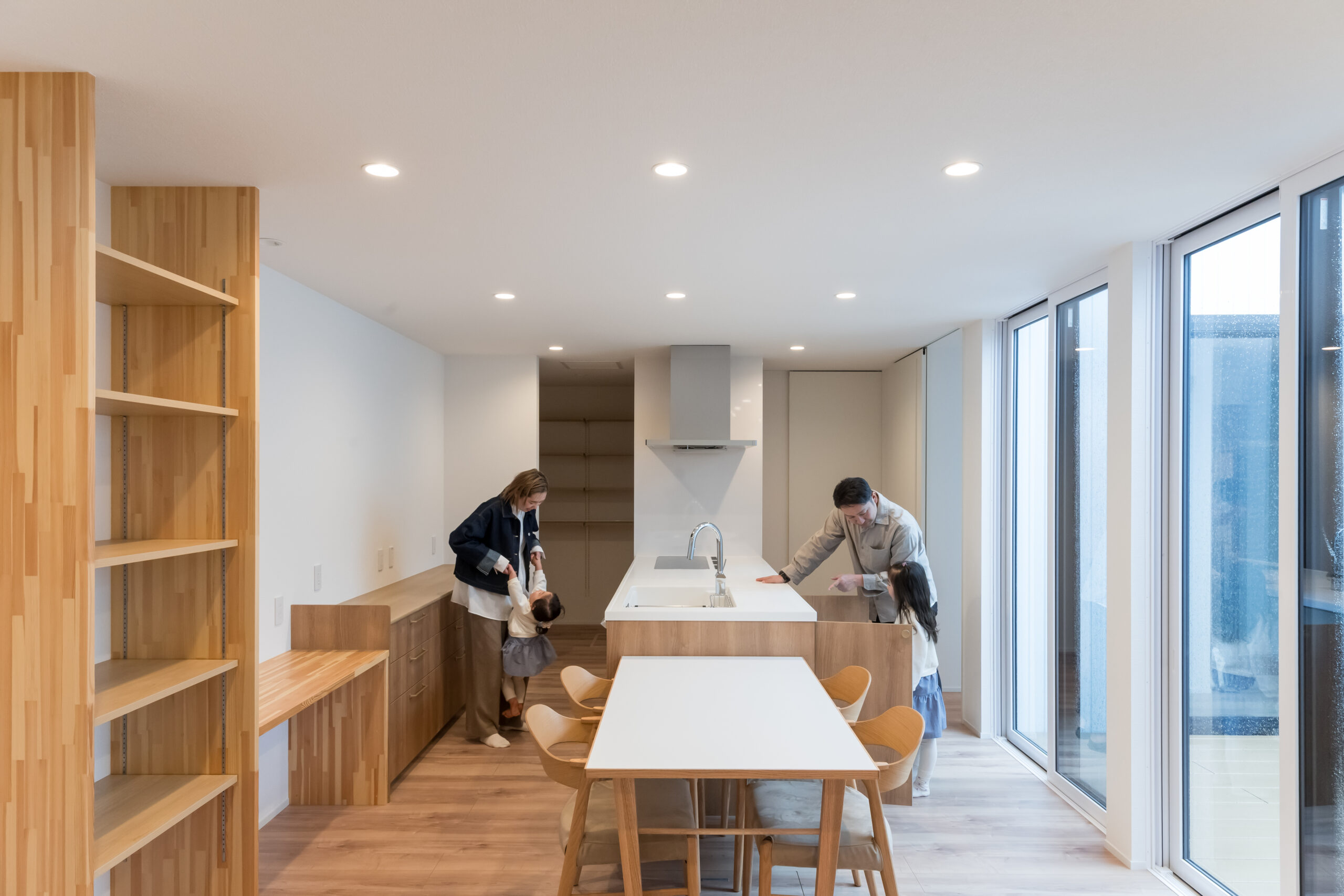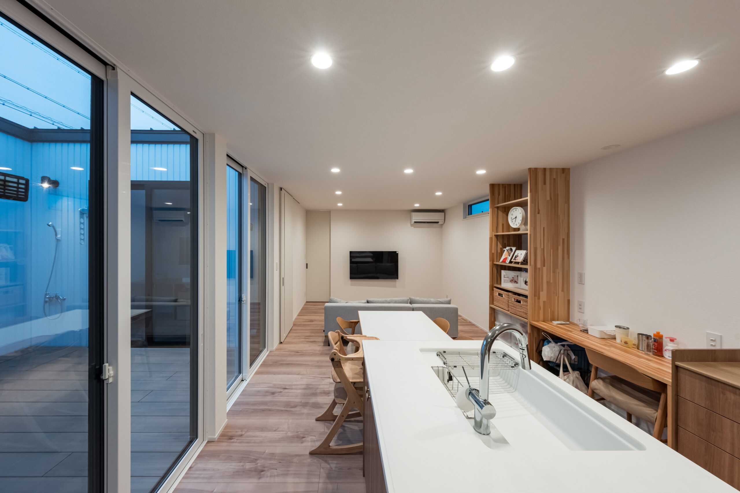 当初は何も考えず2階建ての家づくりをイメージしていたけど、モデルハウスで体感した『平屋×中庭×回遊動線』のプランに大きな衝撃を受け、「中庭暮らし」に家づくりの舵を切った、とのこと。 実際に手にした「中庭暮らし」は、周囲の目を気にする事なく子供達を安全に遊ばせることができますし、防犯性が高く家族を守れる事も安心です。カーテン無しで、いつも明るいLDKはお気に入りの場所ですし、中庭を中心とした回遊動線はどこに行くにも近くて快適です。とうれしそうに話してくれました。