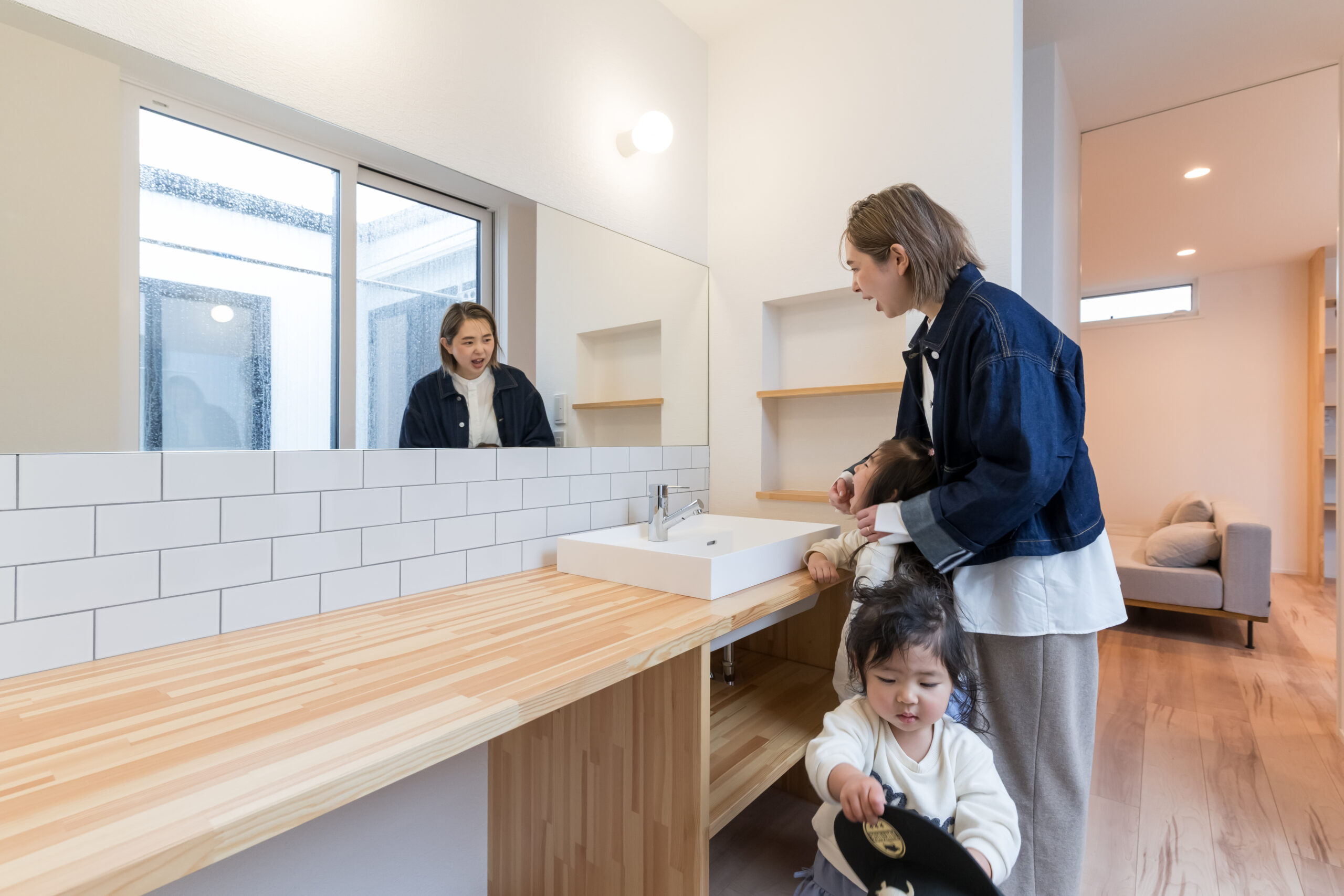 • 造作洗面/ 子供達が大きくなったら、洗面は取り合いになるだろう。 同時に2人が使える洗面は、奥様からの強い要望でした。 こだわりのホワイトのタイルやニッチやブラケットライト。 奥様のお気に入りの空間となりました。