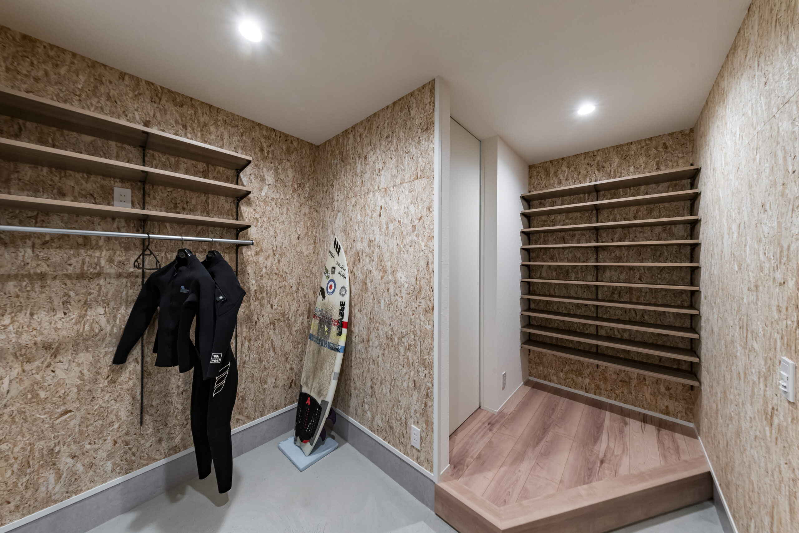 • シューズクローゼット・土間収納/趣味の道具や中庭を楽しむ道具を収納したい。 そんな要望を叶えるために広さにこだわりました。 仕上げ材をガレージっぽさを演出してくれるOSB合板にすることでカッコいい空間に。 今後の生活スタイルの変化によって棚を増やすことができます。