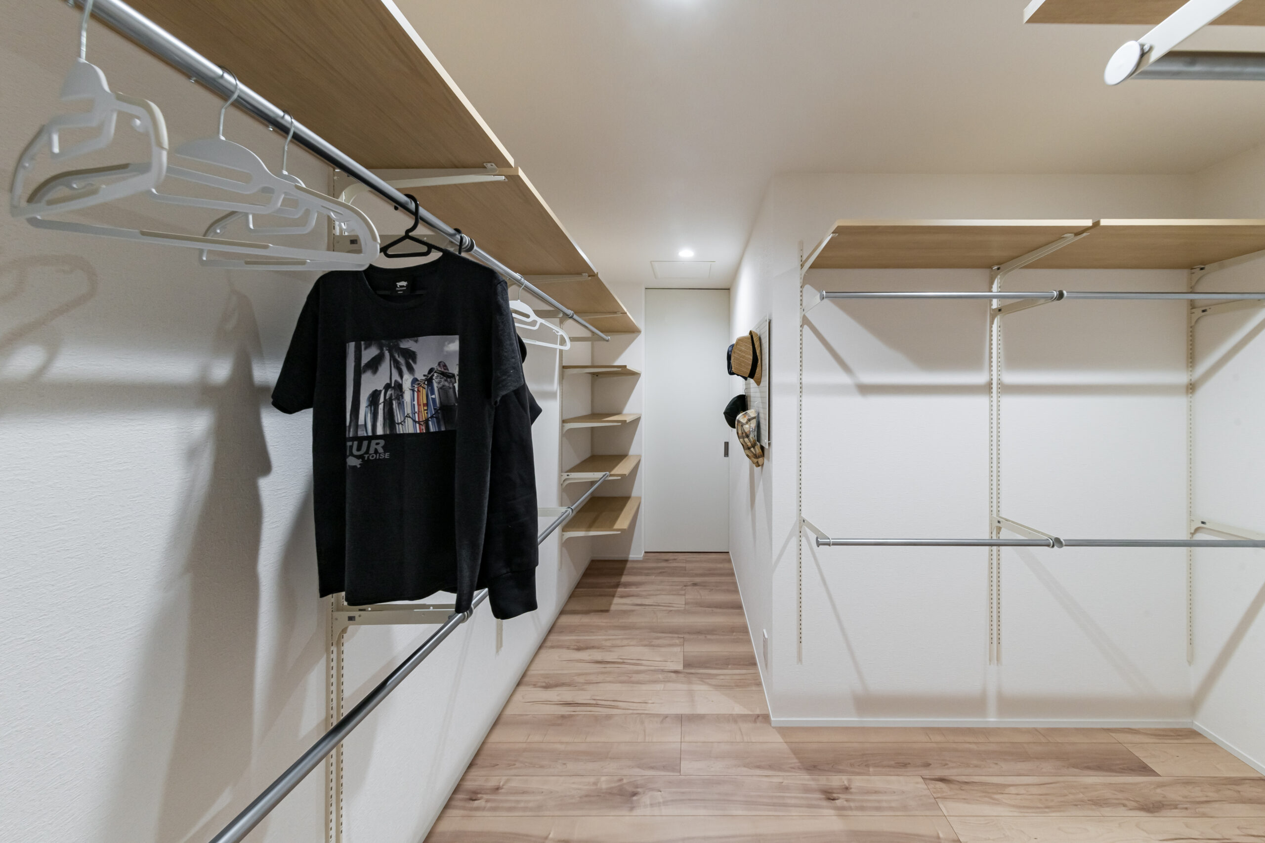 • ファミリークローゼット/ 家族みんなおしゃれが大好き。広さと収納方法にはこだわりました。 上下2段のハンガーパイプや有効ボードの収納を取り入れることで、 生活のスタイルに応じて、可変性のある収納を採用しました。